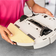 Наповніть резервуар чистою водою до відмітки "макс", надійно прикріпіть м'яку мікрофіброву серветку до спеціальної платформи за допомогою зручних липучок. Тепер встановіть цю платформу на нижню частину робота до характерного клацання. Переконайтеся, що серветка щільно контактує з поверхнею підлоги - і ваш RCV 5 миттєво приступить до вологого прибирання.