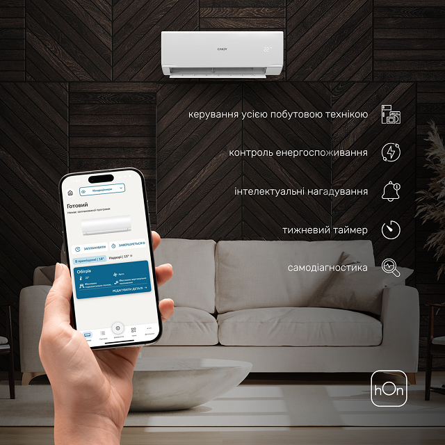 Застосунок hOn відкриває повний контроль над кондиціонером у смартфоні: задавайте температуру, змінюйте режими, створюйте індивідуальні сценарії роботи та графіки запуску. Система Smart Control дозволяє заздалегідь охолодити або обігріти приміщення — кондиціонер автоматично ввімкнеться до вашого повернення додому.