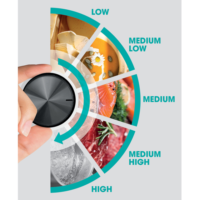 Вибирайте рівень потужності відповідно до потреб готування. Висока потужність стане в пригоді, коли потрібно нагріти щось якомога швидше. Наприклад, якщо треба скип’ятити воду або приготувати прозорий суп, доречною буде найбільша потужність. Помірно висока потужність дає змогу смажити чи готувати на парі, а низька підходить для приготування крем-супу або для використання приладу в режимі сушарки.