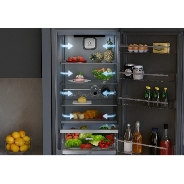Технологія FreshLock з інтелектуальним керуванням 6TH SENSE рівномірно розподіляє прохолодне повітря по всьому холодильнику та підтримує стабільну температуру без коливань. Результатом є до 30% довша свіжість продуктів, які зберігають свій смак, колір та харчову цінність. М'який повітряний потік захищає природну структуру продуктів та створює ідеальні умови для їх зберігання – щодня, без компромісів.