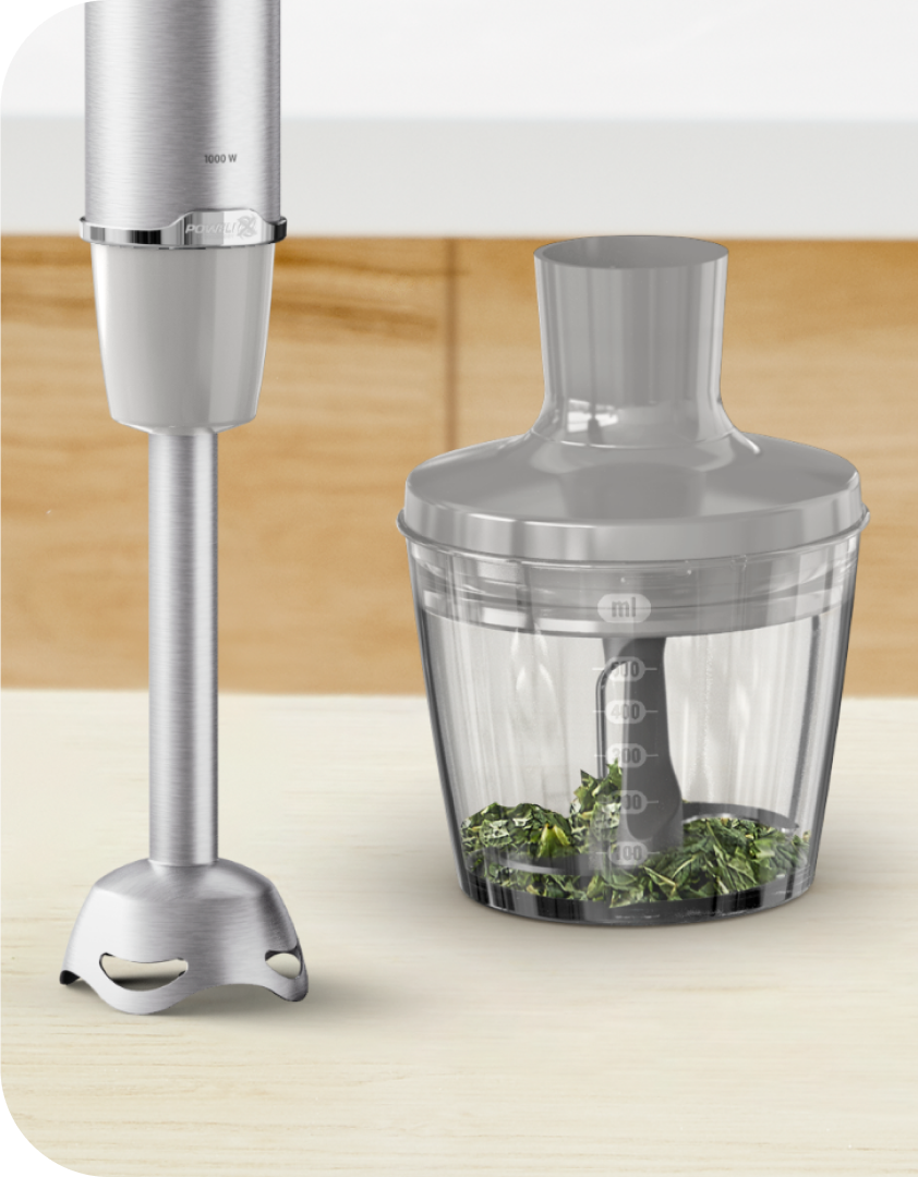 Місткий подрібнювач об’ємом 500 мл з надзвичайно гострими лезами допоможе вам впоратися з найскладнішими завданнями й зекономить час.
