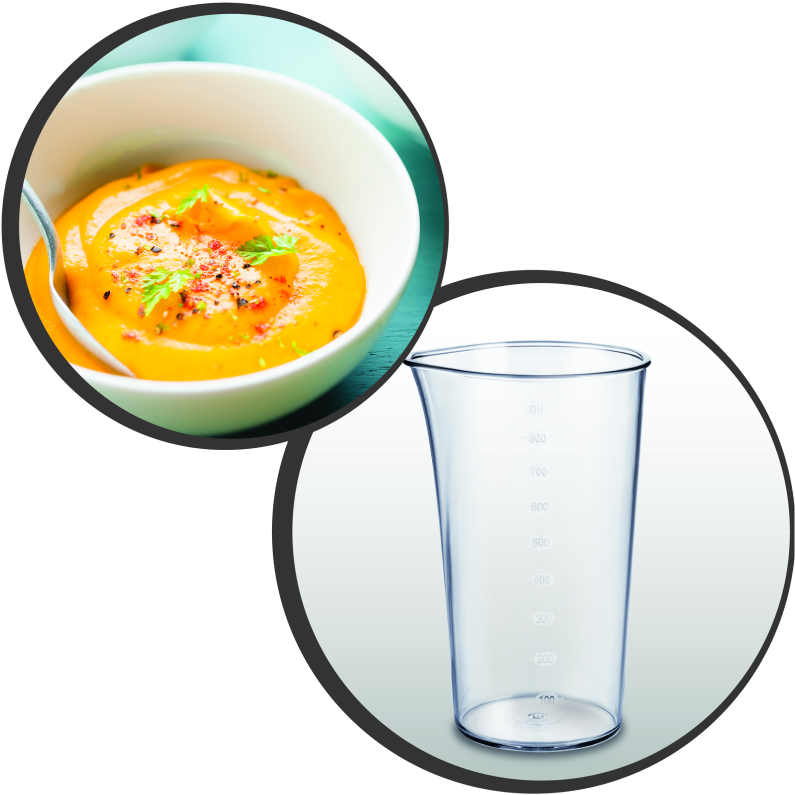 Вимірюйте об’єм рідини чи сипких продуктів в декілька рухів із допомогою зручного й точного мірного стакана на 800 мл. Зберігайте ідеальну рецептуру ваших кулінарних шедеврів.
