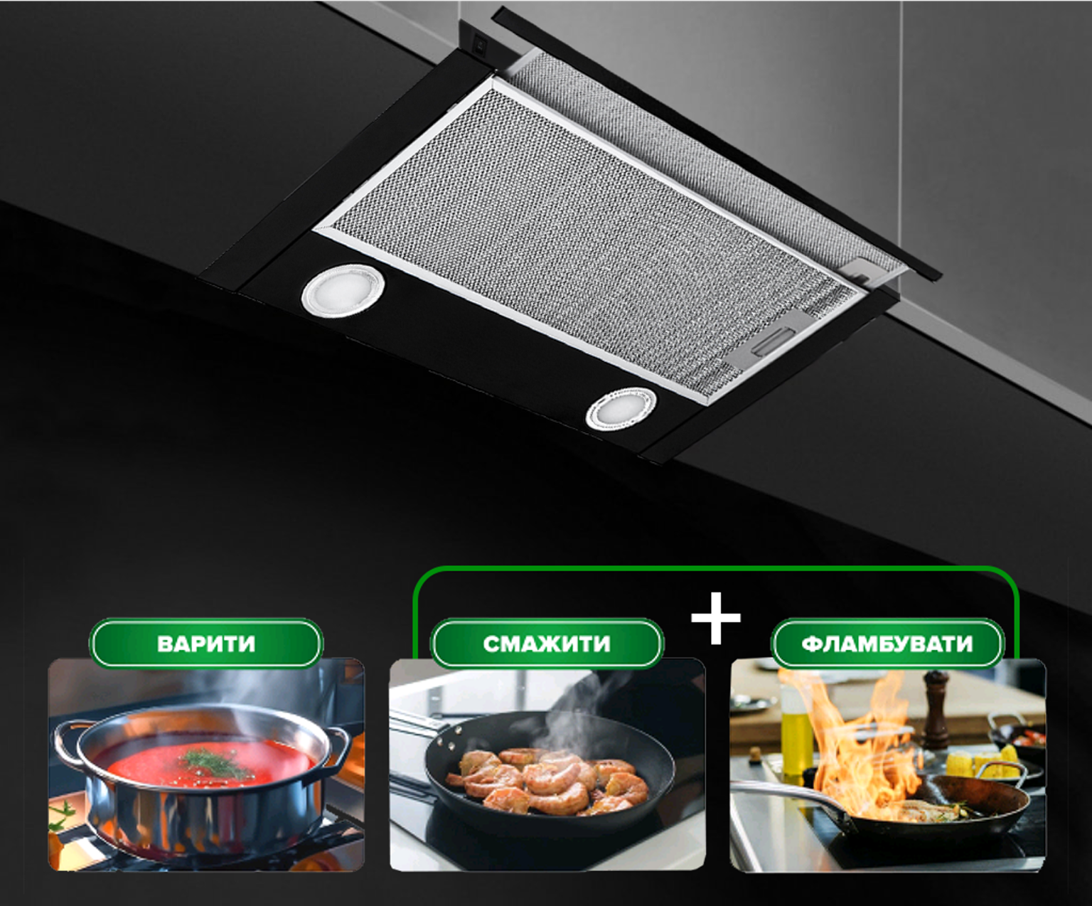 Увімкніть необхідну потужність в залежності від інтерсивності готування. З вас кулінарний шедевр, з нас чисте повітря!