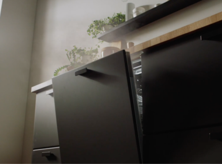 Для кухонь з високими фасадами необхідна особлива конструкція дверцят посудомийної машини, при якій вона повинна відкриватись так, що б фасад не чіпляв нижній цоколь.