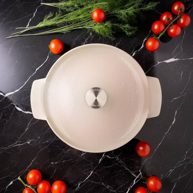 Європейський бренд KitchenAid, відомий своїми якісними продуктами та інноваційними технічними рішеннями. Це стосується як найскладнішого обладнання, на зразок кухонних комбайнів або міксерів, так і фірмового посуду. Ця модель, виготовлена з міцного чавуну з елементами з нержавіючої сталі та емальованим покриттям, привертає увагу елегантним і красивим, продуманим дизайном зі збереженням цілком доступної вартості.