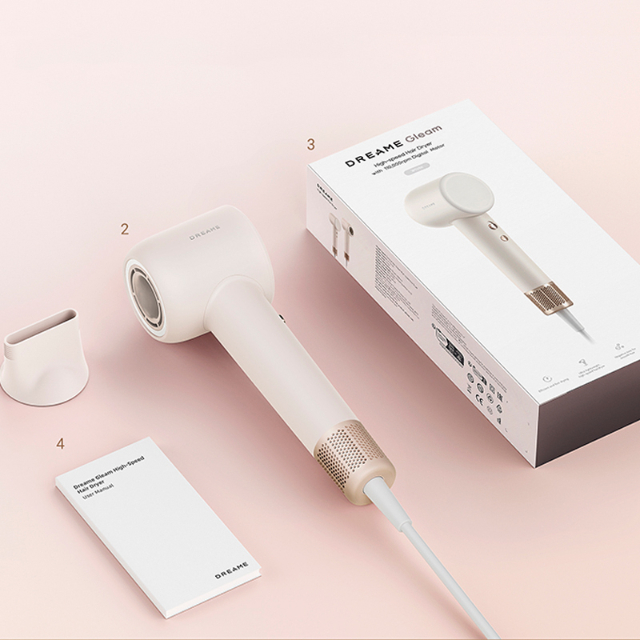 Dreame Hair Dryer Gleam — це розкішний рожевий дизайн і матовий корпус, приємний на дотик. Фен компактний та зручно лягає в руці. Він важить 330 грамів, що робить його ідеальним для подорожей. А в комплекті поставляється все необхідне: фен з насадкою-концентратором та інструкція.