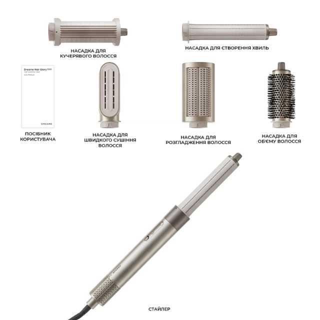 Стайлер для сушіння та укладання волосся Dreame Air поставляється з різноманітними насадками, які дозволяють реалізувати будь-які стилістичні задумки. Завдяки цьому комплекту ви зможете експериментувати з укладанням та досягати професійних результатів у домашніх умовах.