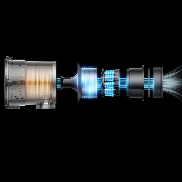 Циклон усередині фільтра обертається з високою швидкістю, утворюючи величезну відцентрову силу. Великі частинки пилу викидаються в пилозбірник під дією відцентрової сили, а 10 конусів ріжуть повітряний потік для швидкої та ефективної роботи пилососу.