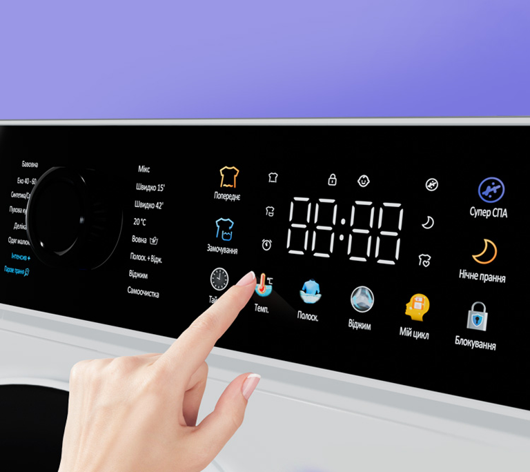 Сенсорний кольоровий екран та зручний поворотний регулятор дозволяють легко керувати великою кількістю програм прання та додаткових опцій.