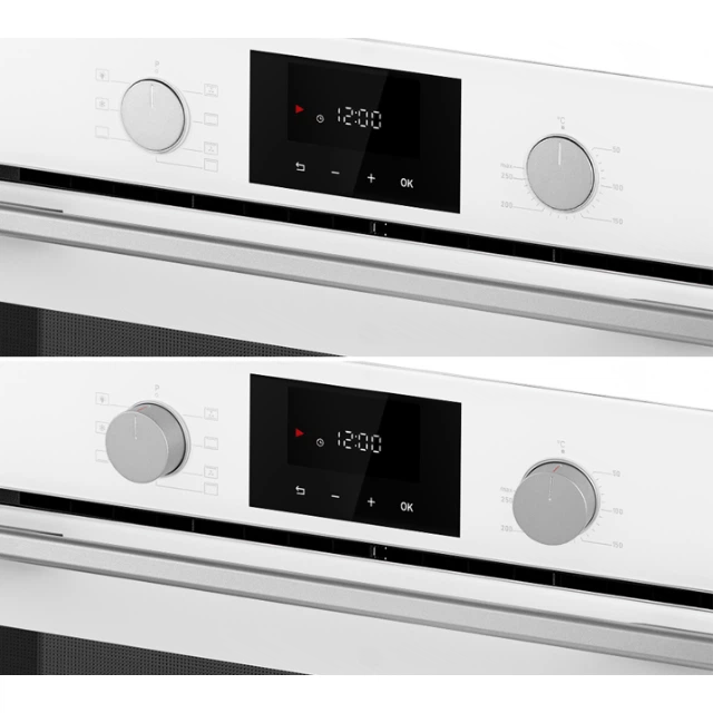 Керування духовою шафою реалізоване у вигляді поворотних утоплюваних ручок з термостійкого пластику та сучасного дисплея.