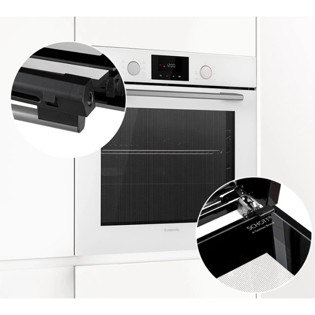 Дверцята духової шафи мають подвійне скло від німецького бренду SCHOTT, яке забезпечує ефективну термоізоляцію. Воно зберігає тепло всередині камери, знижує споживання електроенергії та захищає від опіків.