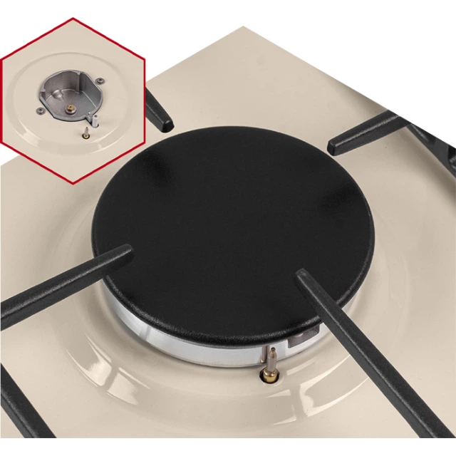 Для вашої безпеки поверхня оснащена системою захисту «газ-контроль». Вона блокує подачу газу в разі згасання полум’я в конфорці, забезпечує захист від пожежі та унеможливлює витік і отруєння газом