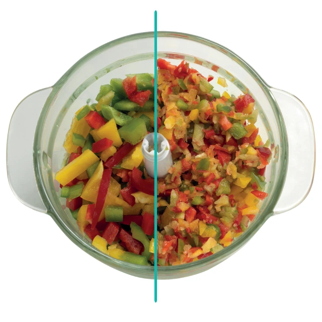Подрібнювач із високоякісними ножами — це ідеальний помічник під час приготування страв із різною текстурою. Використовуйте його, щоб швидко нарізати великі шматки овочів або фруктів, подрібнити горіхи або приготувати кремоподібне пюре.