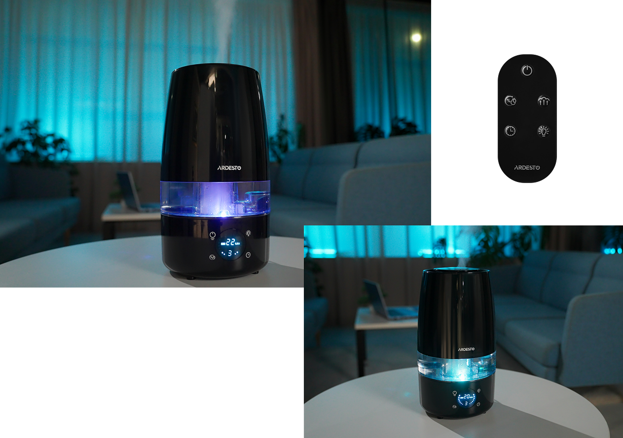 Модель має сенсорне керування і пульт, за допомогою якого можна перемикати режими, регулювати інтенсивність випаровування і встановлювати таймер навіть на відстані.