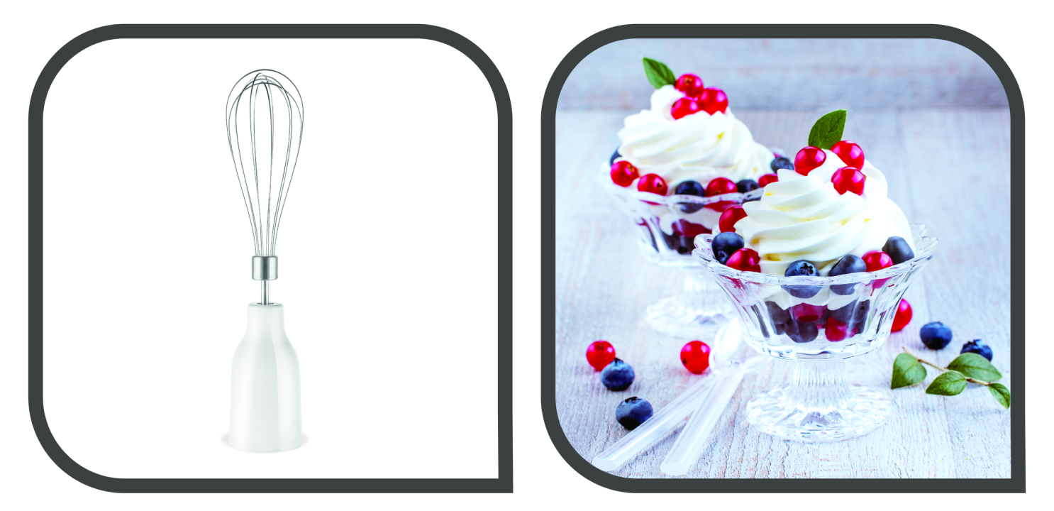 Збиває яєчні білки, вершки, пишні креми для десертів та рідке тісто для млинців.