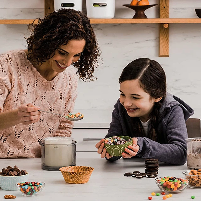 У комплекті до морозивниці ви отримаєте буклет з детально розробленими рецептами. Спробуйте кожен з них і обирайте улюблений. Також зручно застосовувати 3 контейнери по 1.4 л. Спробуйте одразу три різних смаки або приготуйте десерти про запас. Ці резервуари можна зберігати в холодильнику, інгредієнти точно не зіпсуються, адже контейнер щільно закривається кришкою. Коли вони стануть пустими, просто завантажте їх у посудомийну машинку для кришталевої чистоти.