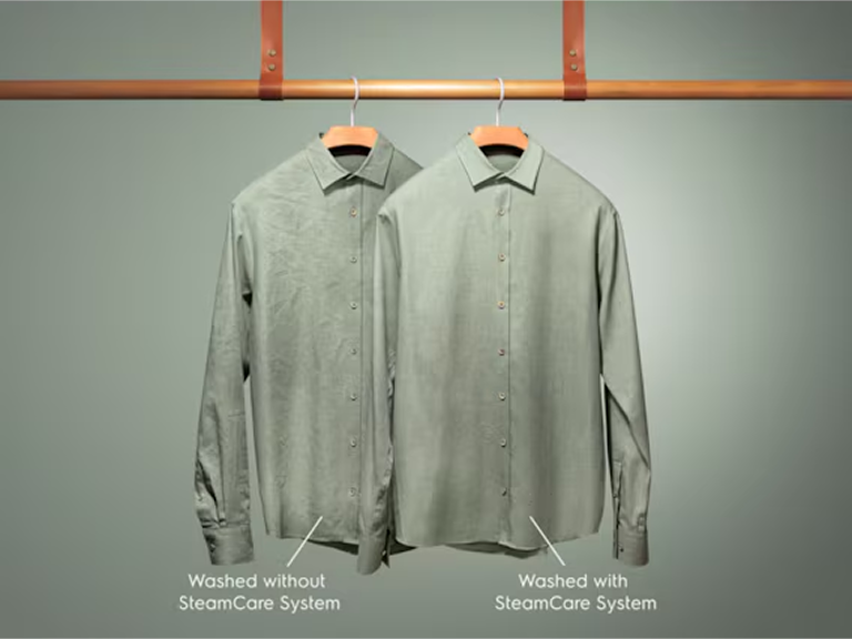 Завдяки нашій системі SteamCare одяг має значно менше складок. Завдяки додаванню пари наприкінці прання волокна розслаблюються і складки зменшуються на третину. Одяг довше виглядає краще без додаткового нагрівання під час традиційного прасування.
