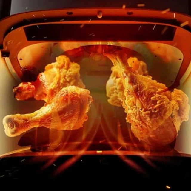 Модель використовує циклонну систему циркуляції повітря: вентилятор рівномірно розганяє гаряче повітря по всій камері. Це дозволяє готувати з меншою кількістю олії або взагалі без неї — наприклад, круасани або овочі, розкладені на деко, можна рівномірно підрум’янити з усіх боків. Конструкція вентиляційних каналів запобігає утворенню гарячих зон, тому їжа не підгоряє по краях і не залишається сирою всередині. Режим також знижує ризик висушування м’яких інгредієнтів — наприклад, шматочків кабачка чи грибів у запіканці.