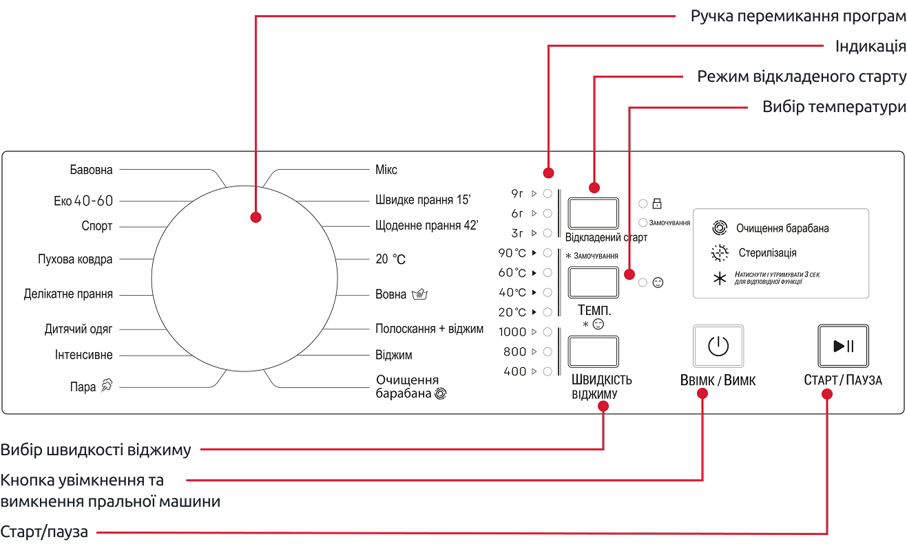 Функція “Захист від дітей” дозволяє заблокувати панель керування пральної машини, щоб діти не могли змінити налаштування чи випадково вимкнути програму. Це гарантує безпечне використання техніки та спокій батьків під час прання.