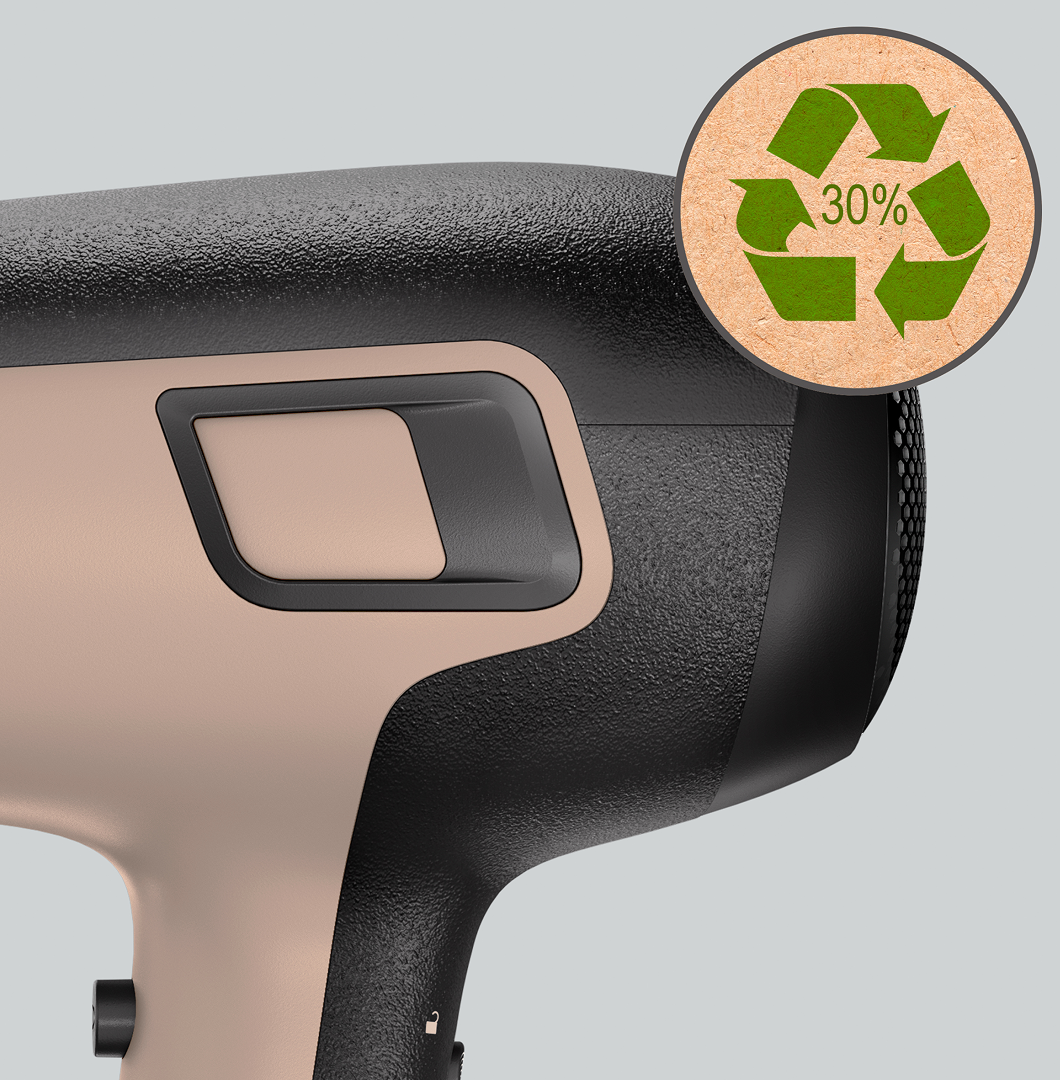 Фен виготовлений щонайменше на 30% із перероблених матеріалів, включно з 60% переробленого пластику.