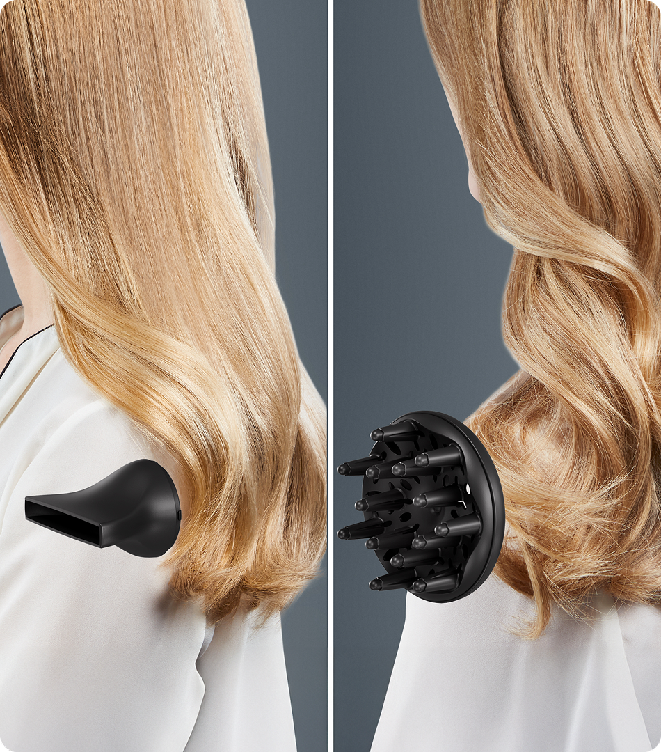 Насадка-концентратор спрямовує точний потік повітря, а дифузор надає об’єм і формує чіткі вишукані локони.