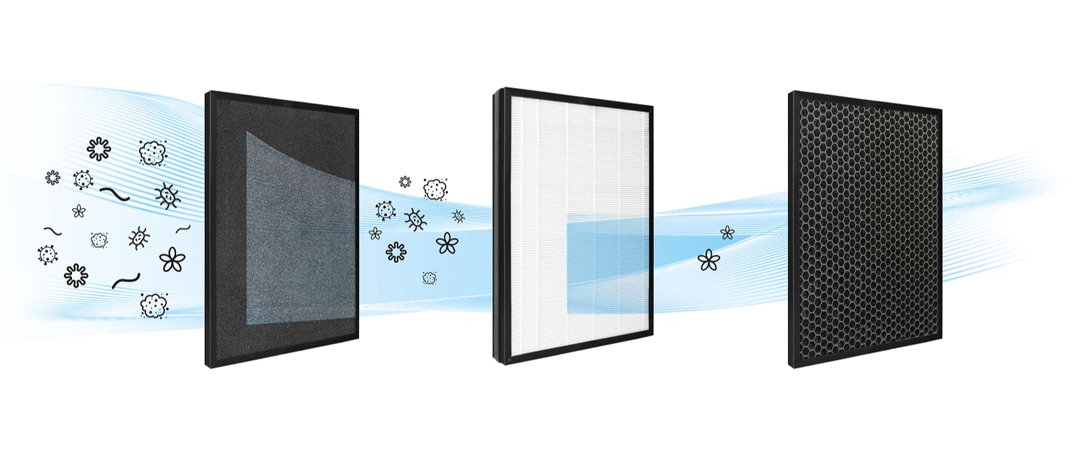 Очищення повітря проходить через три етапи: попередній фільтр затримує великі частинки пилу й шерсть, HEPA-фільтр усуває до 99,95% дрібних частинок і алергенів, а вугільний фільтр поглинає запахи та леткі органічні сполуки — для свіжого й безпечного повітря в оселі.