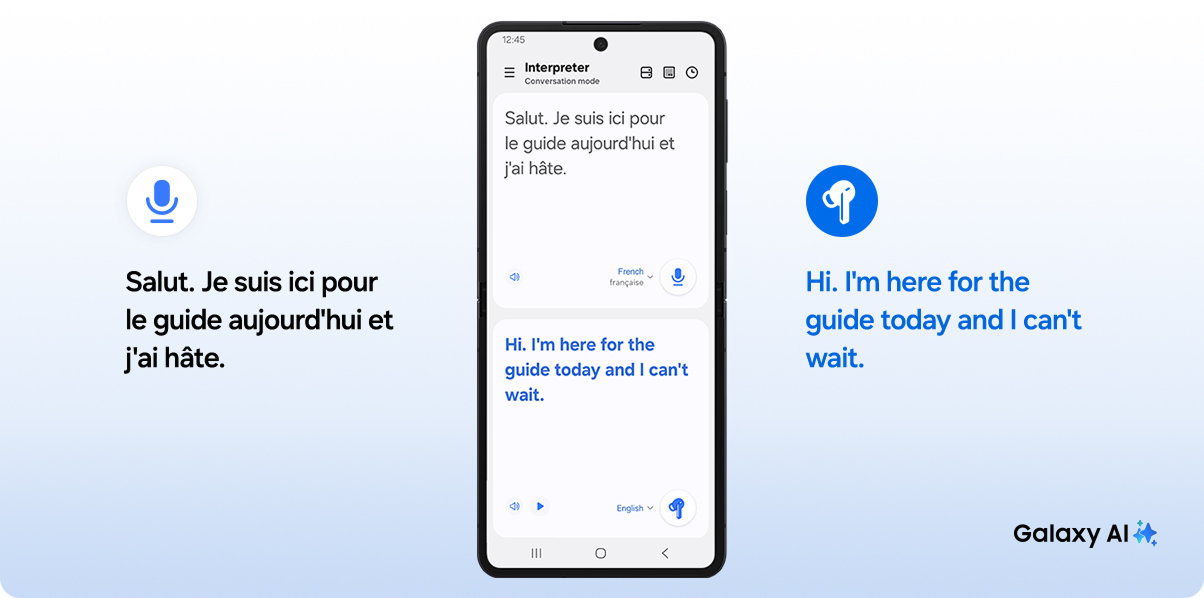 Щоб увімкнути режим розмови, направте мікрофон телефона до співрозмовника і ненадовго натисніть на Galaxy Buds3 FE, щоб почути переклад у режимі реального часу.