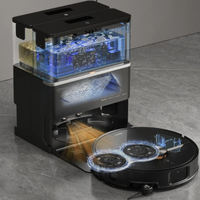 Мультифункціональна база бере на себе повний цикл обслуговування робота — від очищення пилозбірника до догляду за швабрами. Вам фактично залишається лише контролювати процес через додаток. Станція автоматично очищає пилозбірник робота, промиває швабри струменями води під тиском і запускає сушіння гарячим повітрям. Сценарій знижує ваші контакти з брудом, а наступний цикл прибирання щоразу починається з чистих інструментів.