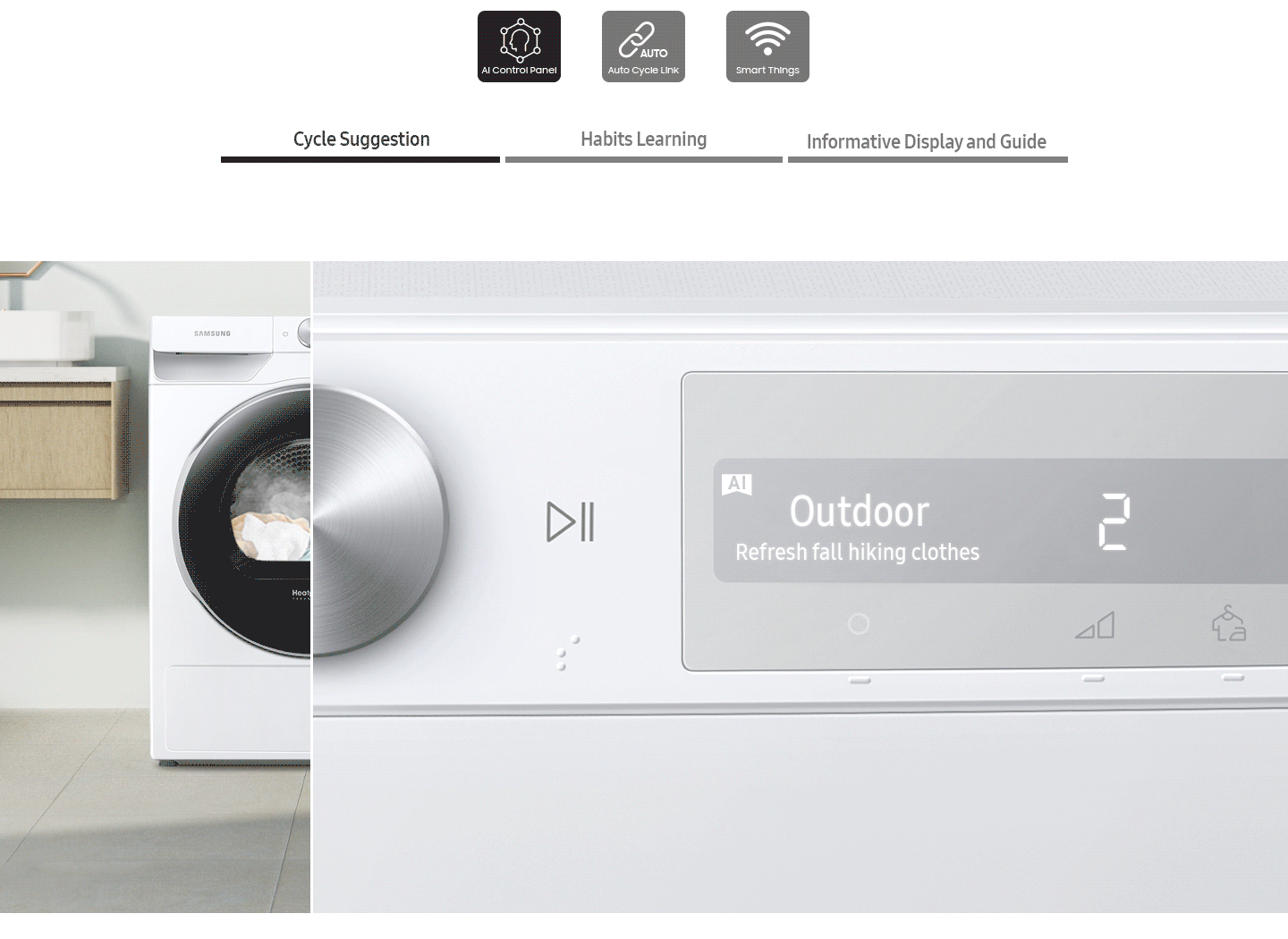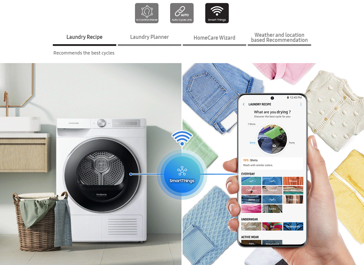 Періть білизну легко та ефективно з AI Control. Вона індивідуально налаштовує прання, запам'ятовуючи ваші звички, пропонуючи програми* та показуючи актуальну інформацію. Застосунок SmartThings** пропонує поради щодо циклів, планування та усунення несправностей і навіть вибирає ідеальну програму сушіння залежно від циклу прання***.