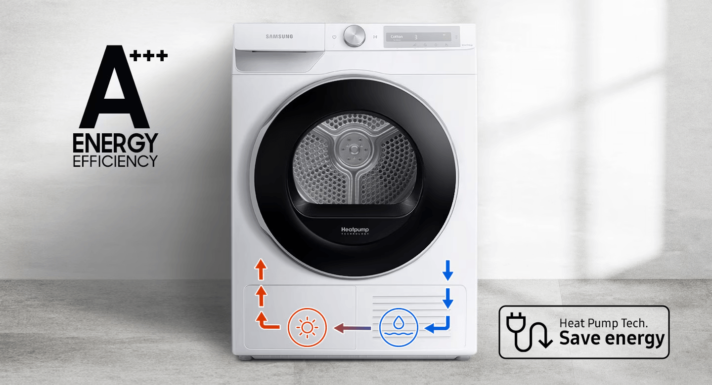 Споживайте менше електроенергії* завдяки технології теплового насоса. Має клас енергоефективності A+++ шляхом використання «холодоагенту» замість електрики для нагрівання повітря та рециркуляції теплого повітря, що запобігає витратам енергії.