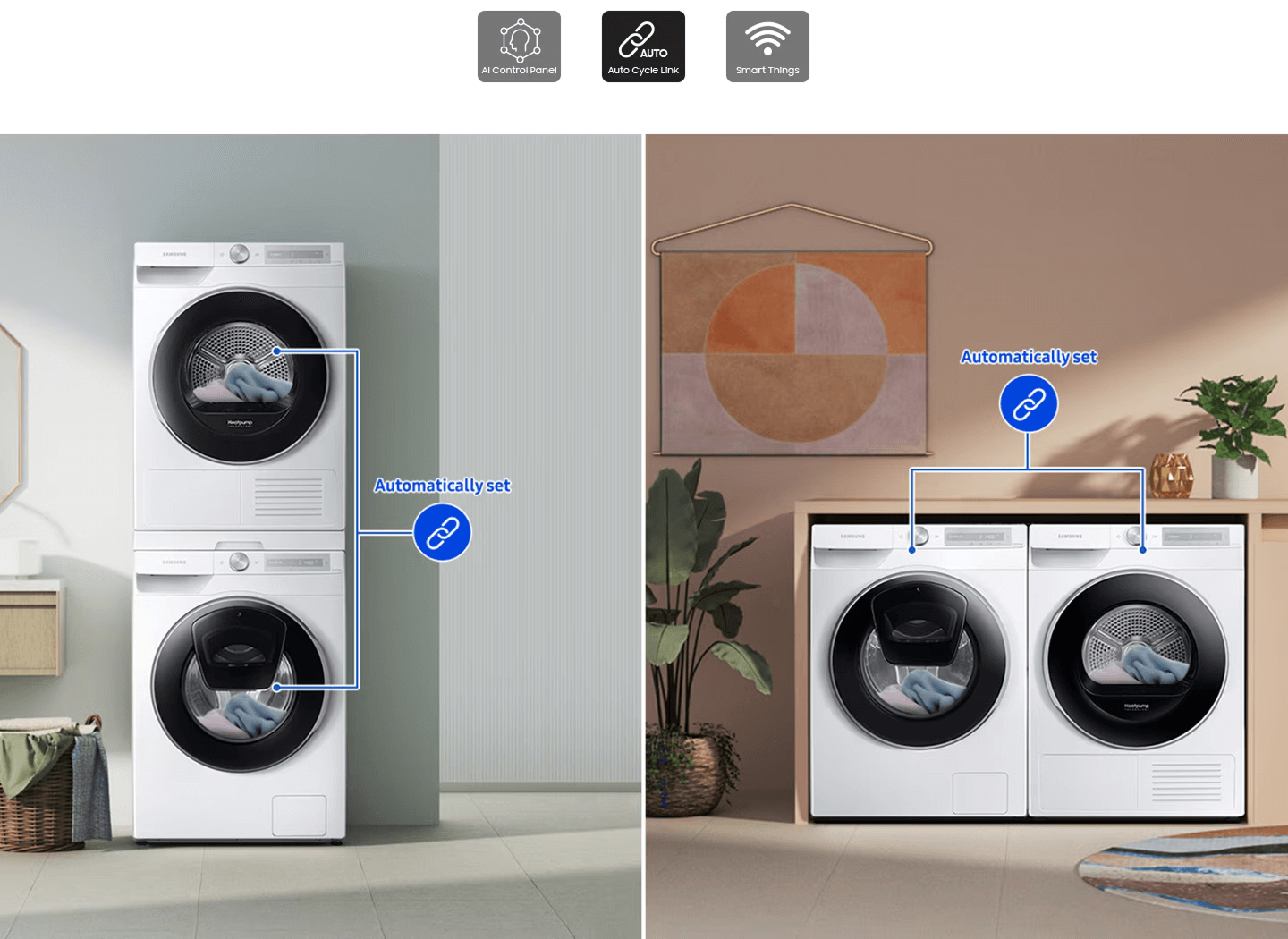* Доступно на пристроях Android та iOS. Потрібне підключення до Wi-Fi та обліковий запис Samsung.** Функція Auto Cycle Link доступна лише у випадку, коли пральна та сушильна машини мають функцію AI Control та підключені до Wi-Fi.※Зображення мобільного інтерфейсу (GUI) можуть відрізнятися залежно від країни, умов використання тощо.