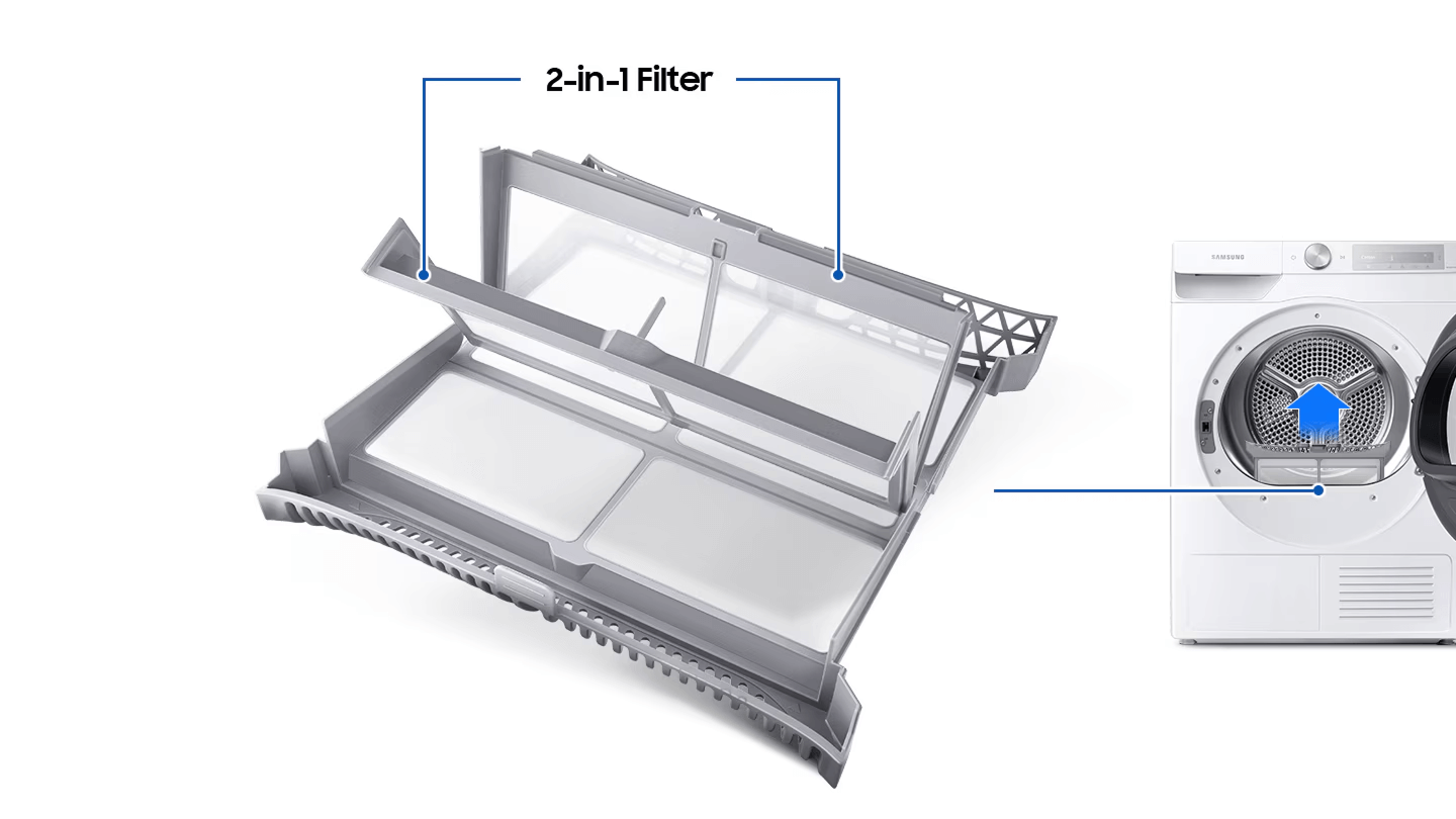 Доглядайте за сушильною машиною легше, оптимізуючи ефективність сушіння та безпеку. Інноваційний Фільтр 2 в 1 містить двошаровий сітчастий фільтр. Завдяки цьому немає потреби у фільтрі теплообмінника, що значно спрощує обслуговування. Обидва сигнали сповіщення також нагадають вам, коли необхідно почистити фільтр і теплообмінник.