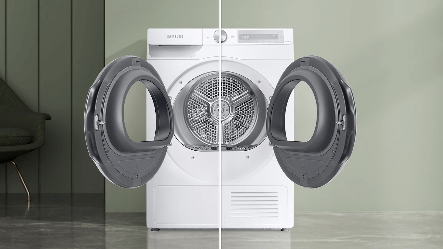 Виберіть напрямок відчинення двосторонніх дверцят відповідно до планування вашого дому. Ви можете просто змінити сторону відчинення, щоб дверцята гармоніювали з місцем розташування пристрою, об'єктів навколо та ваших звичок. Стіни більше не завада! Крім того, прозорі дверцята дозволяють легко побачити процес сушіння.